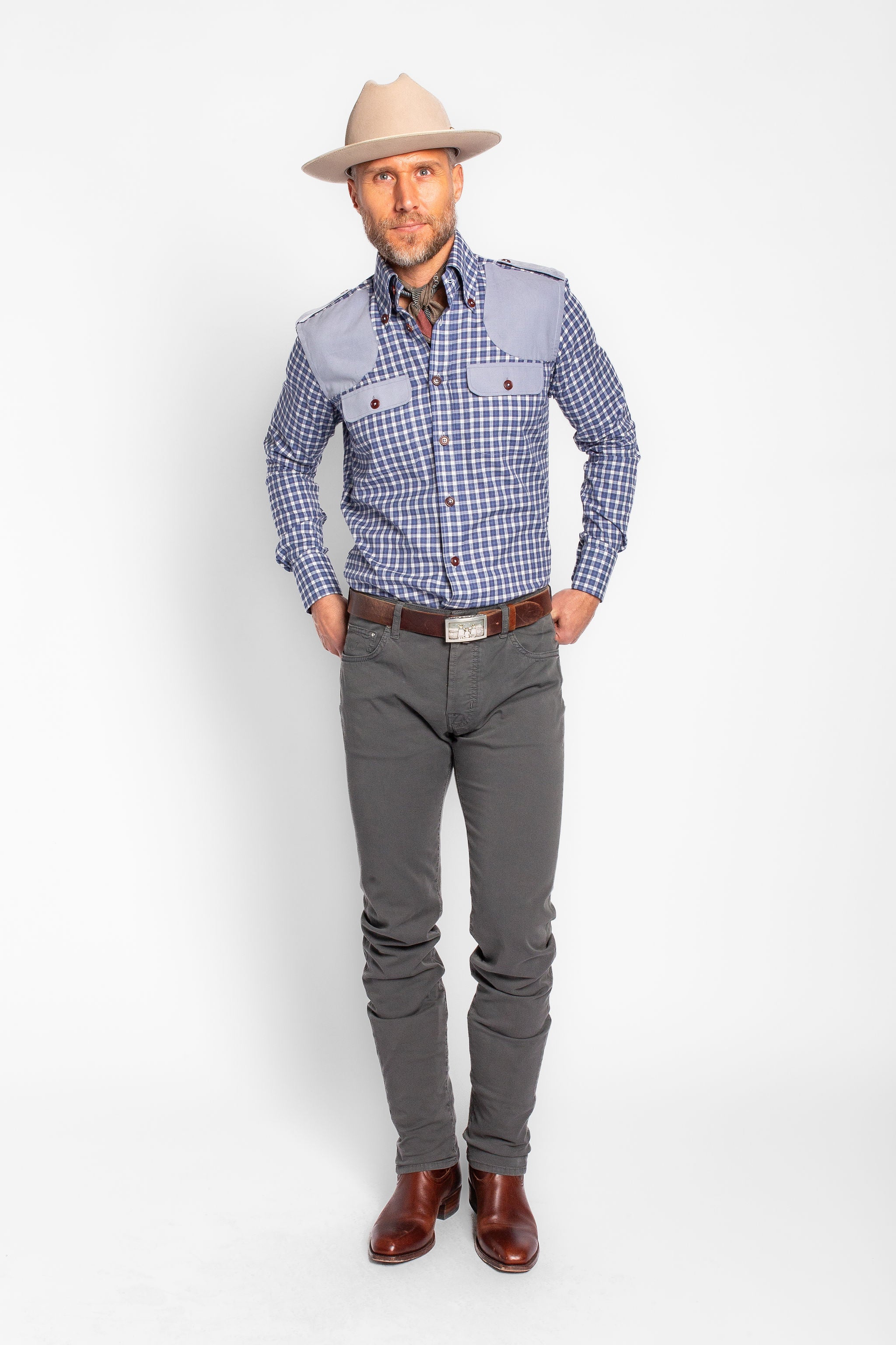Practical and polished, this field shirt features blue corduroy patches, two button cuffs and pleated back detailing. Made from a moisture wicking, breathable, stretch performance fabric. Handcrafted for in the field and ultimate flexibility, this shirt is essential for any sportsman. Luxuriously designed to achieve the highest quality and to weather the most challenging outdoor elements, experience Hadleigh’s not-so-standard sports shirt.