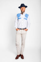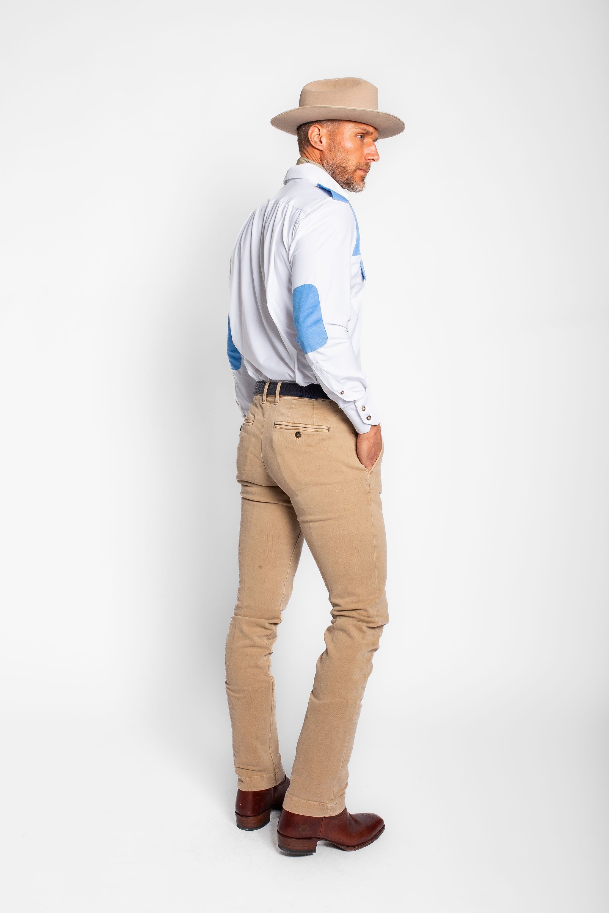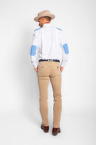 Practical and polished, this field shirt features blue corduroy patches, two button cuffs and pleated back detailing. Made from a moisture wicking, breathable, stretch performance fabric. Handcrafted for in the field and ultimate flexibility, this shirt is essential for any sportsman. Luxuriously designed to achieve the highest quality and to weather the most challenging outdoor elements, experience Hadleigh’s not-so-standard sports shirt.