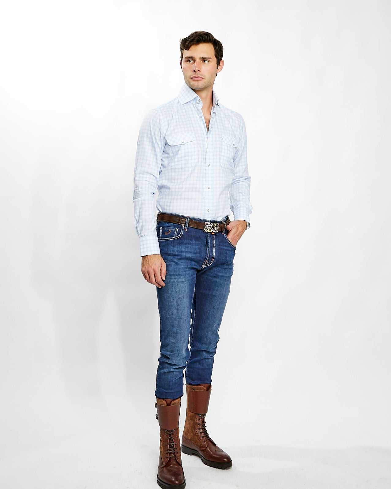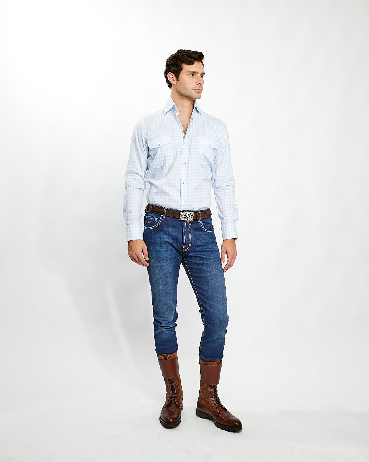 Practical and polished, this field shirt features blue plaid fabric, pearl snap button placket and cuffs. Handcrafted for in the field and ultimate flexibility, this shirt is essential for any sportsman. Luxuriously designed to achieve the highest quality and to weather the most challenging outdoor elements, experience Hadleigh’s not-so-standard sports shirt.