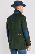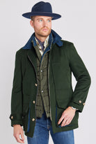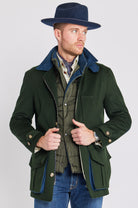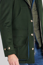 Designed by the Field Shop by Hadleigh's to withstand the elements, the Charlie Coat is crafted using resilient rain proof wool to repel moisture and wind. A box pleated back and front shell pockets provide added convenience and utility. Luxurious Alcantara detailing, including a bold blue collar and elbow patches, offer an elevated contrast to thickly knit rugged green ocra wool, all made by hand in Italy. A button closure and double zip details offer maximum comfort, no matter what the terrain.