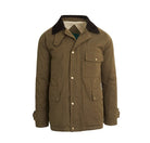 Our western inspired brushed cotton outerwear coat includes brown corduroy collar detailing with coordinating piping on the sleeve cuffs. a relaxed drawstring waist band detail and a western back yoke compliment over-sized front utility pockets with hidden side entry. It's fully lined with a diamond quilted cotton fabric and its waterproof fabrication is available in two colors. Made in Italy