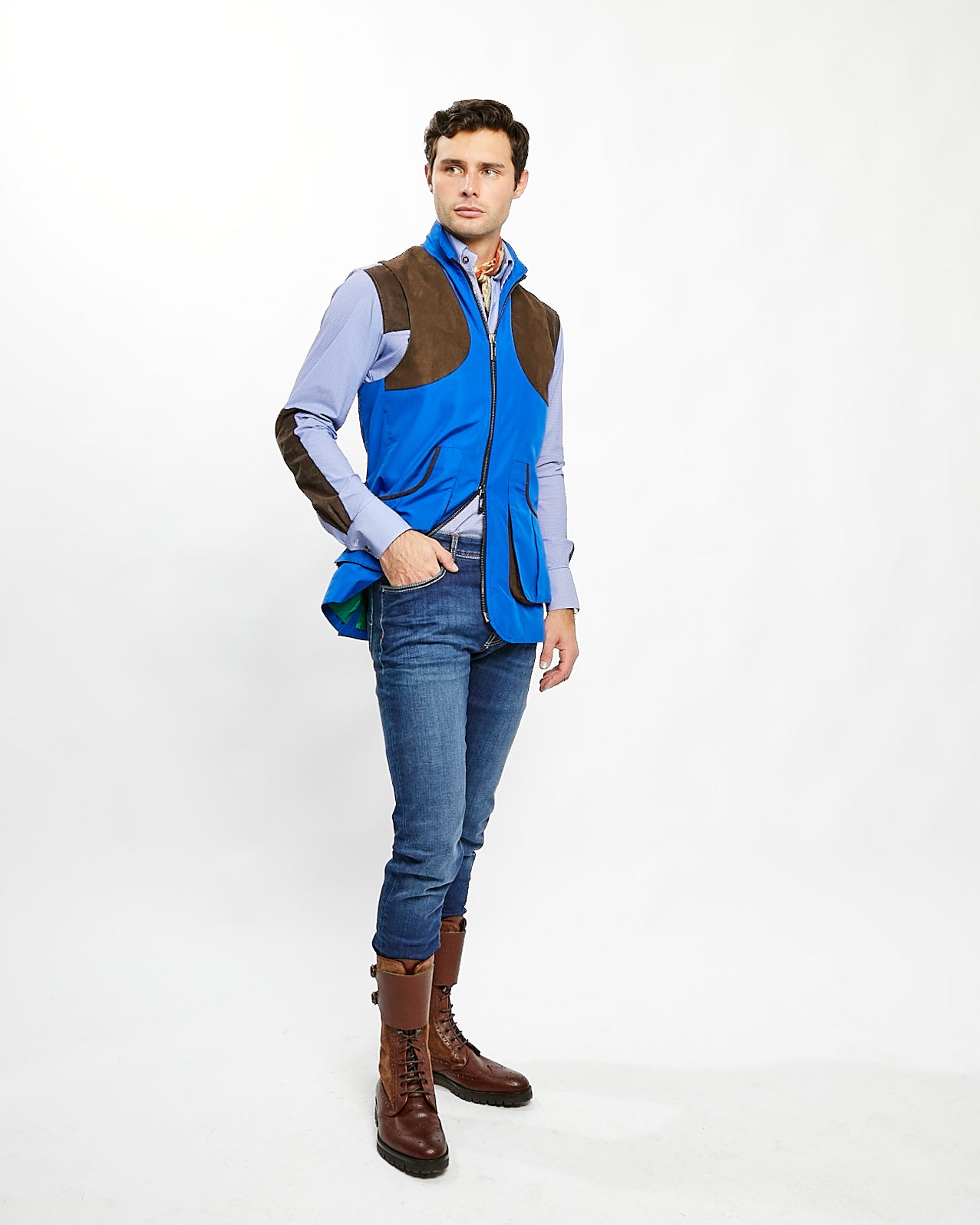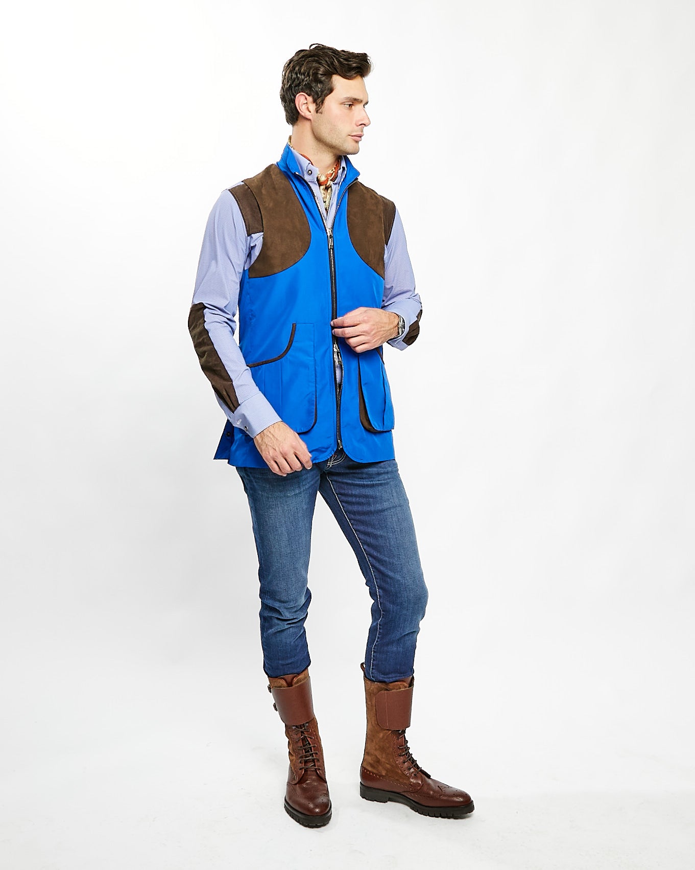 Beautifully handcrafted in Italy using the finest performance nylon fabric and suede sports patches. The Banks Field Vest is meticulously made with Alcantara suede trimming and details. A two-way zip front, and utility pockets flexibility in the fit allow for ultimate agility in the field with the back box pleat, with exceptional range of motion.