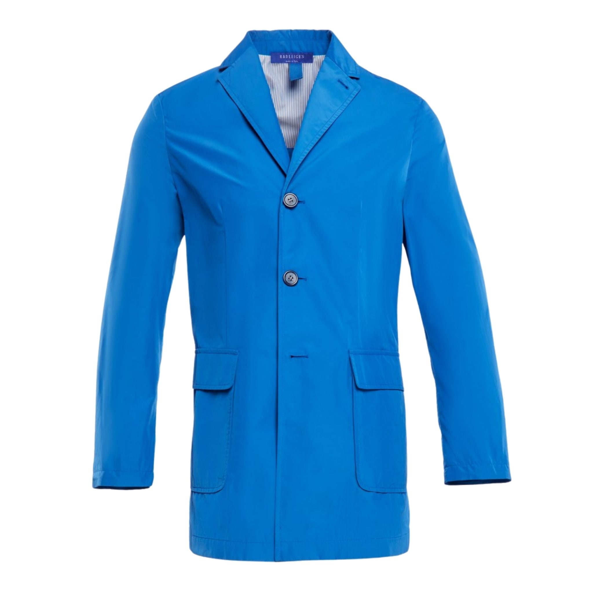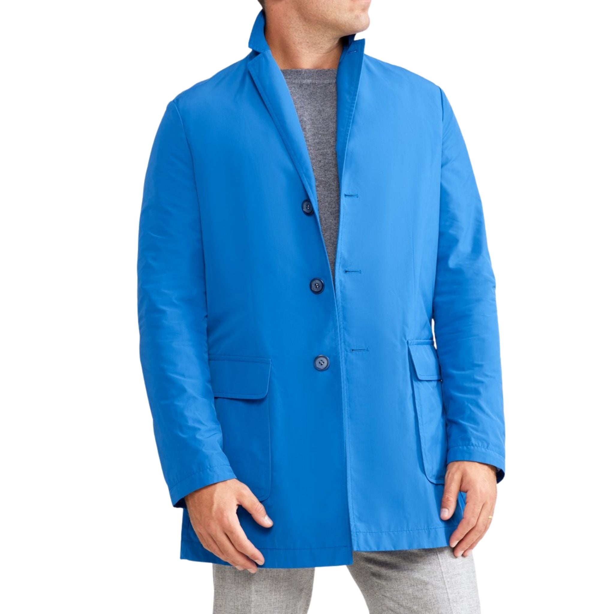 Distinguished nylon raincoat in cobalt with pinstripe cuff detailing and a notch lapel.