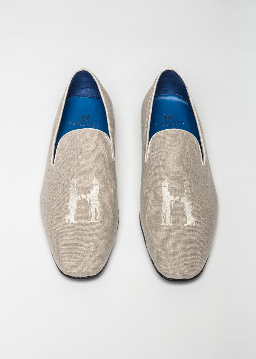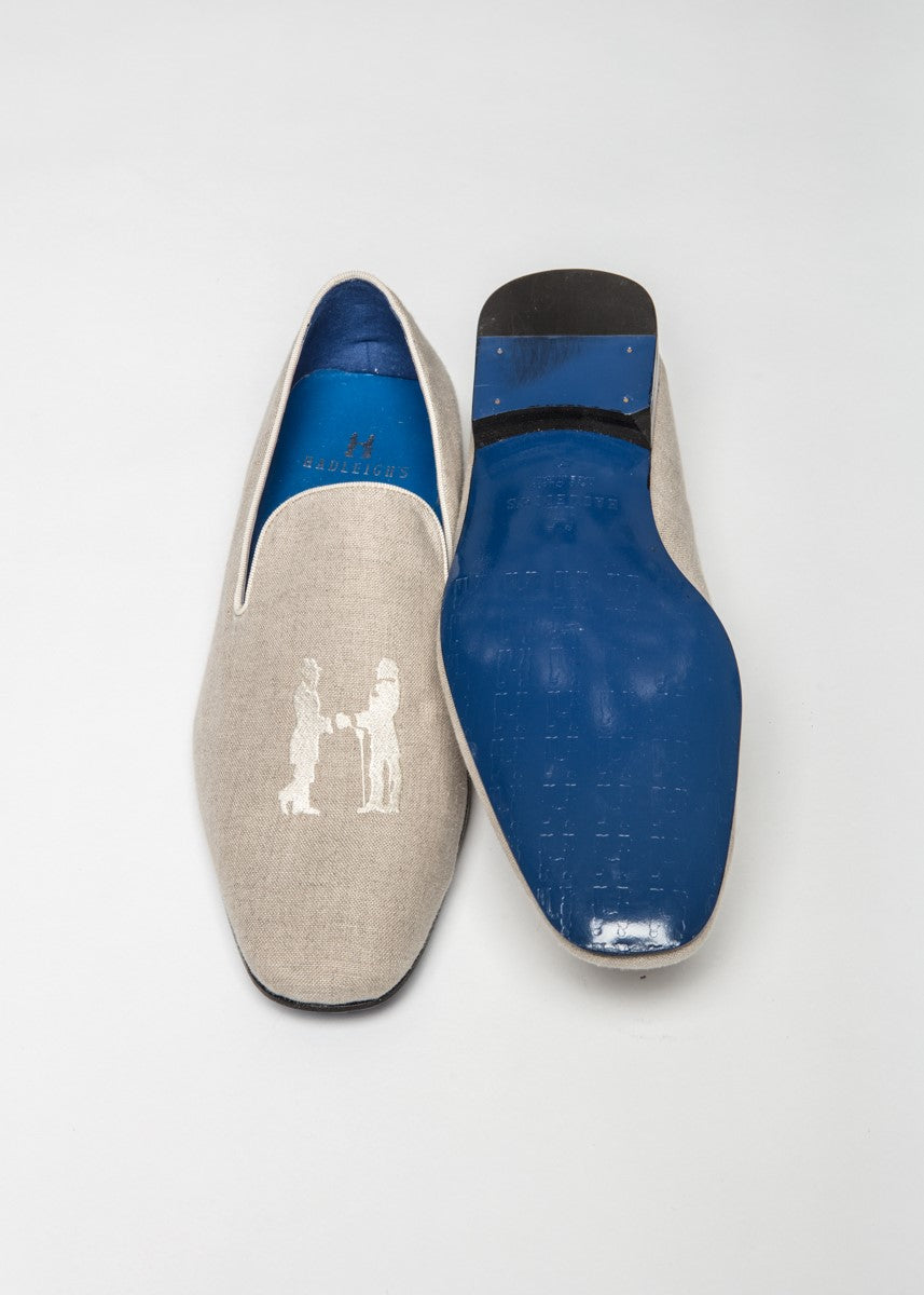 An ode to the gentlemen of Victorian England, our slippers are leisurely yet luxurious and are a staple for every wardrobe. Hadleigh’s signature blue adorns each pair - from the striping on the heel to the logo imprinted outsoles and interior blue leather lining. All of our slippers are hand-made in Italy from the highest quality Italian fabrics. Each slipper is finished with the Hadleigh’s logo, the notorious H-shaped silhouette of two men shaking hands.