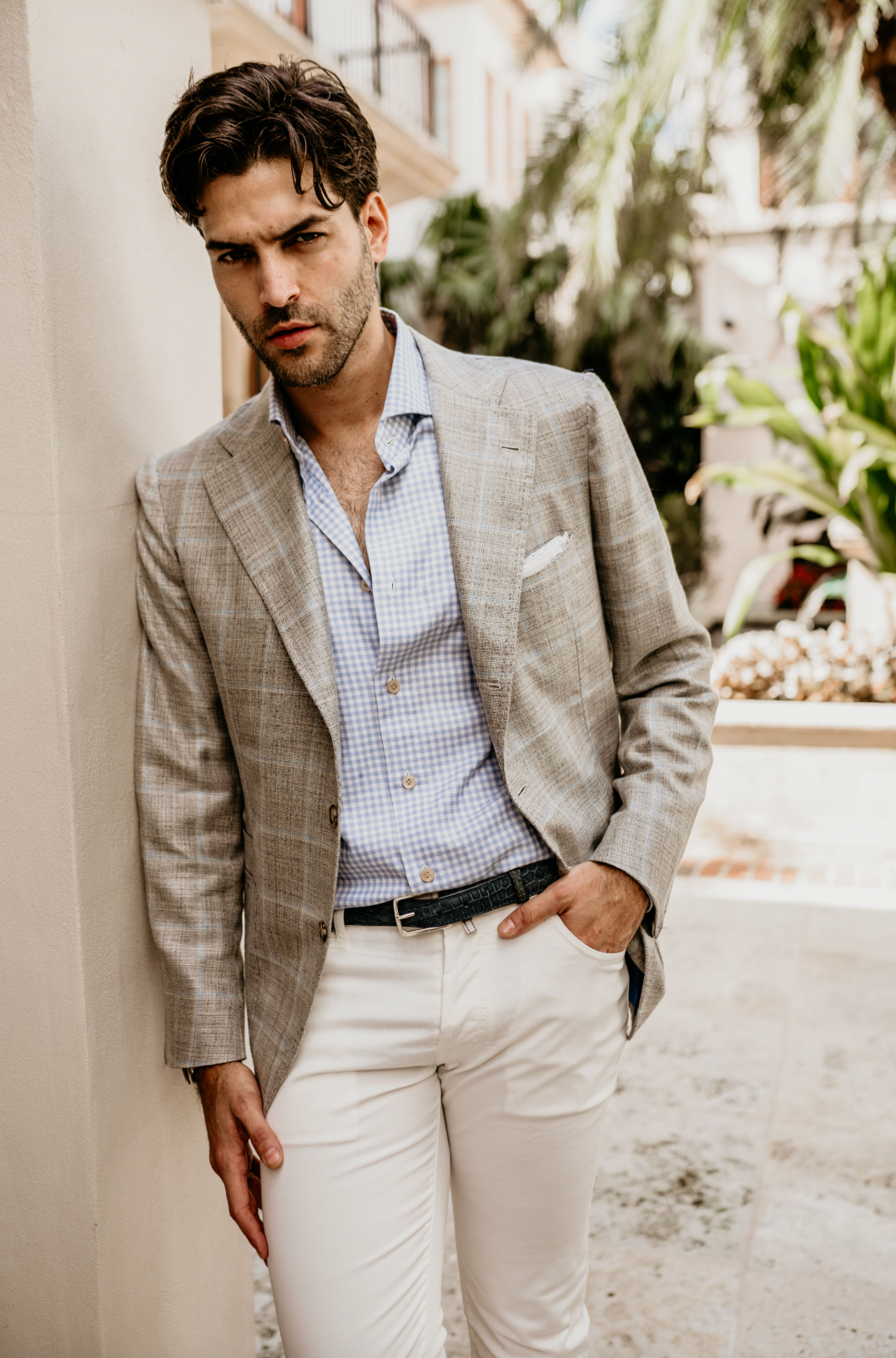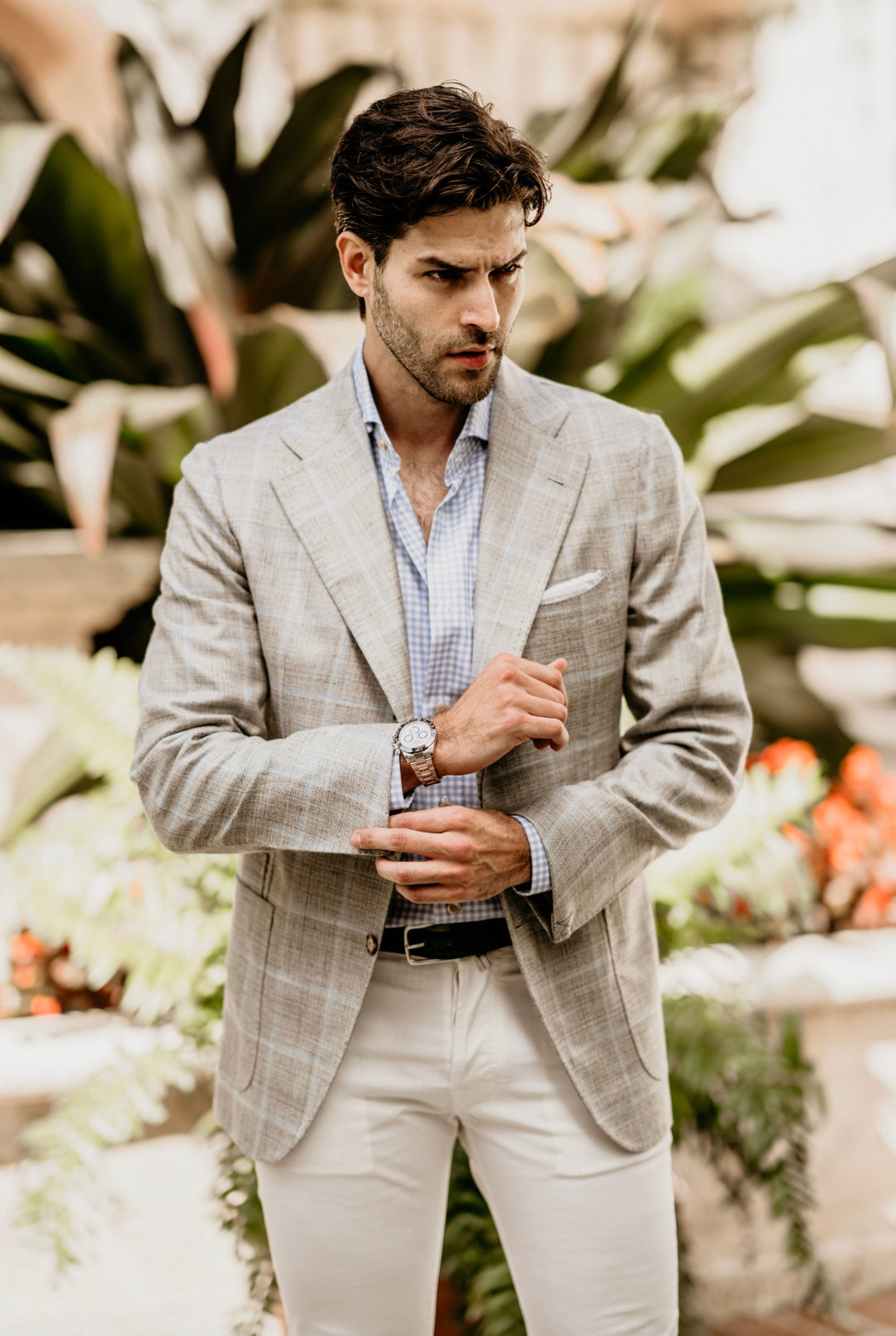 James Jacket in Grey with Baby Blue Windowpane. The James Jacket is One of Hadleigh's Most Essential Wardrobe Pieces. Single Breasted, Notched Lapel, Three Button Roles to Two, Open Patched Pocket, Side Vented, Half Lined. Wool Silk Blend.