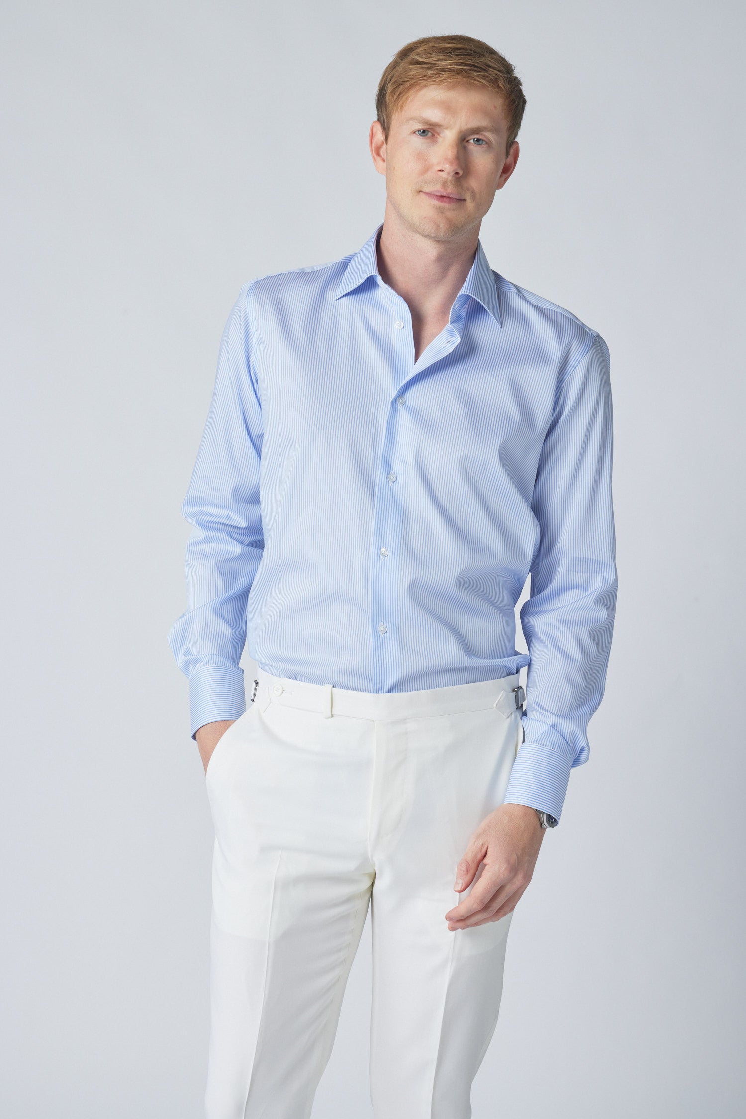 The versatile essential every gentleman needs, Hadleigh's Striped Spread Collar Shirt in light blue is 100% cotton and made in Italy. Boasting a spread Italian type double button collar and classic mother of pearl buttons, this shirt can be worn casually with an open neck or suited up and paired with a sports jacket and tie. Approachable sophistication that can transition seamlessly from the boardroom to the cocktail bar.