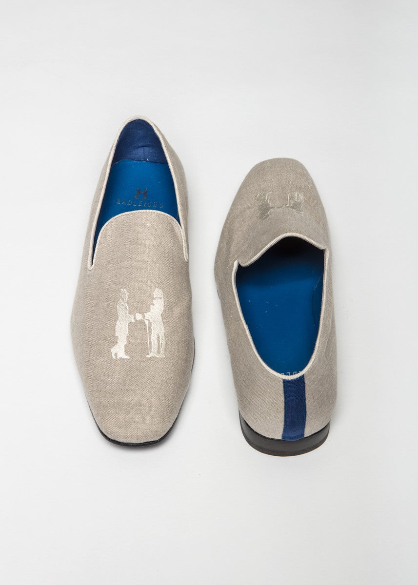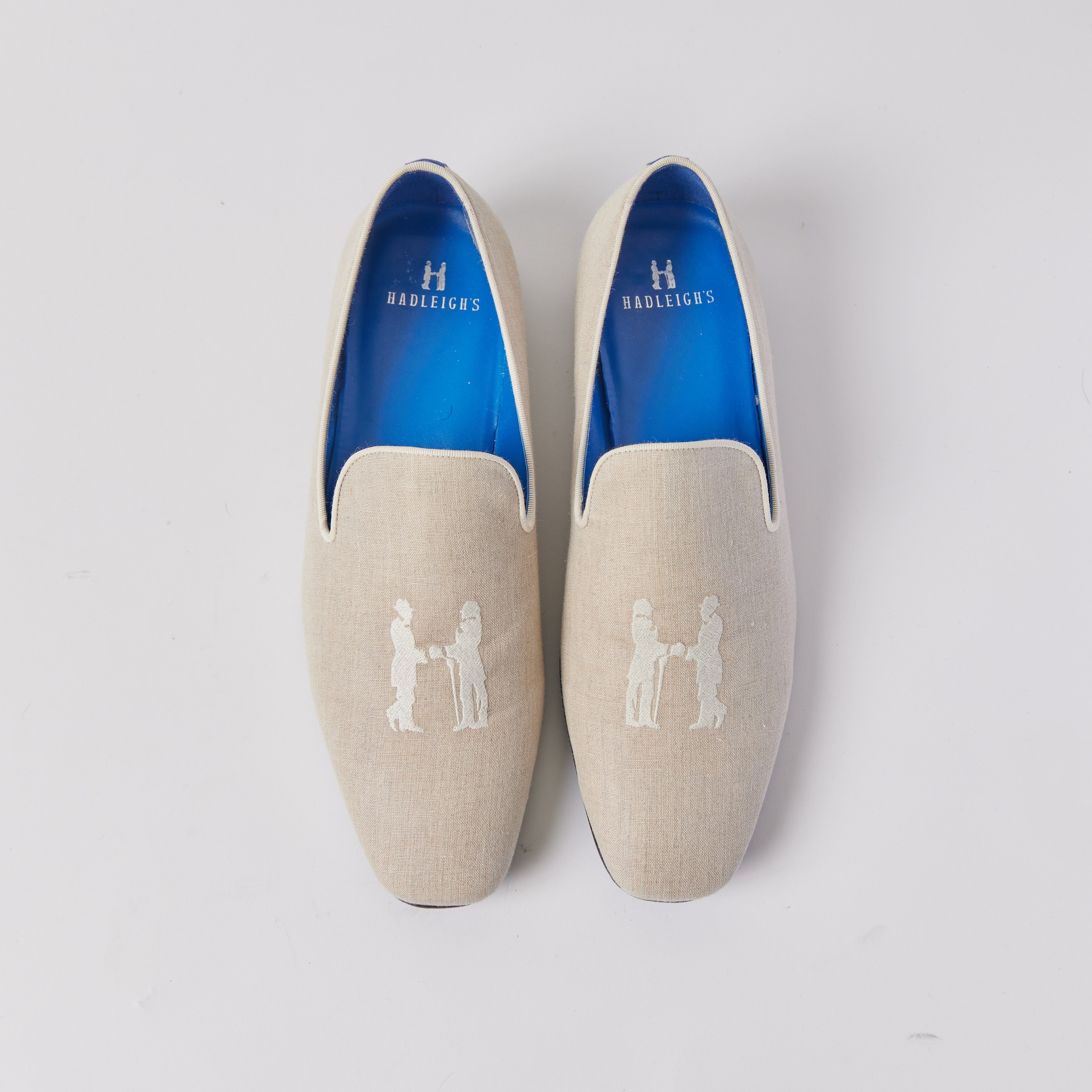 An ode to the gentlemen of Victorian England, our slippers are leisurely yet luxurious and are a staple for every wardrobe. Hadleigh’s signature blue adorns each pair - from the striping on the heel to the logo imprinted outsoles and interior blue leather lining. All of our slippers are hand-made in Italy from the highest quality Italian fabrics. Each slipper is finished with the Hadleigh’s logo, the notorious H-shaped silhouette of two men shaking hands.