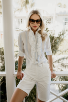 Let us introduce you to our beautiful Belinda, a feminine favorite and Hadleigh's signature blouse. Each ruffle is cut by hand and meticulously sewn in Italy with custom mother of pearl buttons to compliment each blouse, carefully crafted using 100% cotton. With a silhouette that contours and flatters every body type, she is a steadfast staple, especially when coupled with a bold blazer, our flirty Eleanor Skirt and your go-to slippers, heels or sneakers.