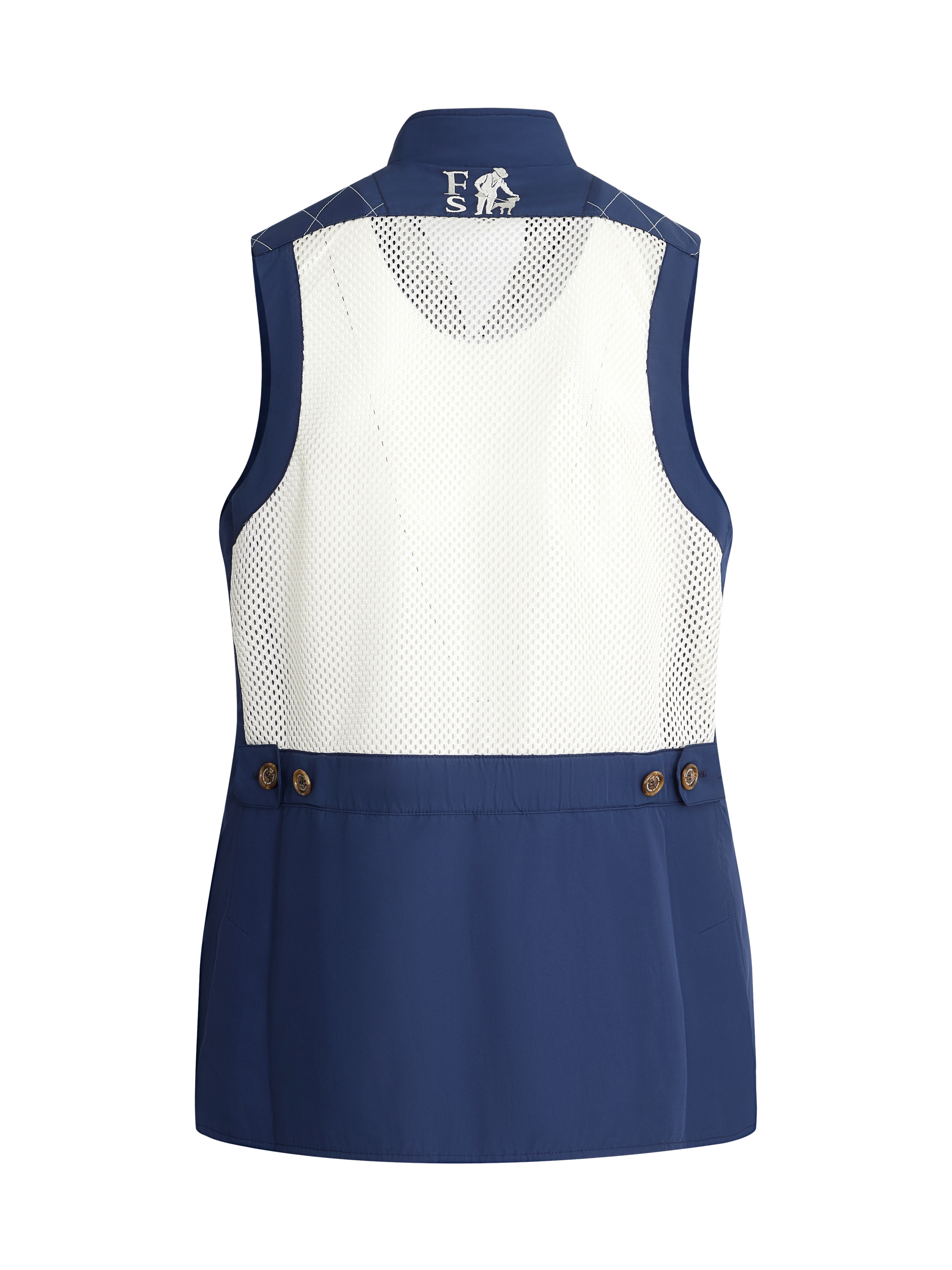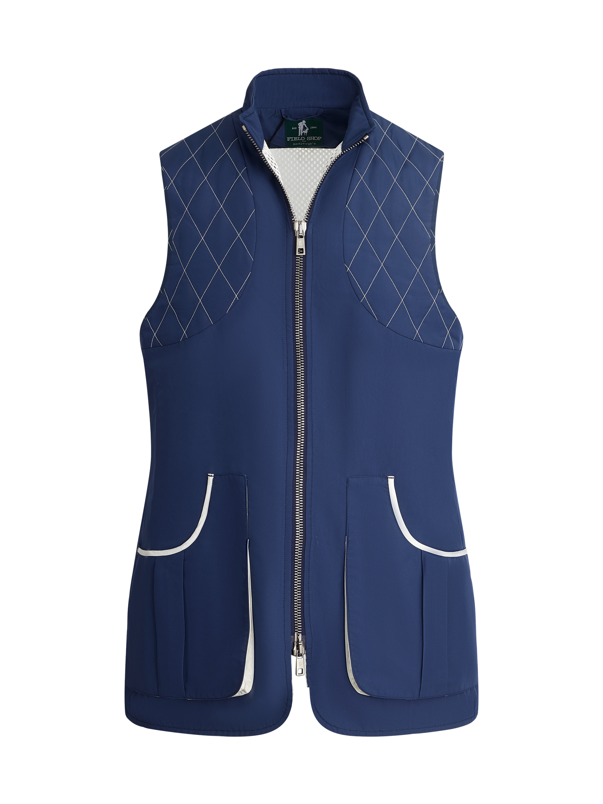 Beautifully handcrafted in Italy using the finest technical fabric with metal hardware tone on tone quilted Navy blue shoulder patches. The Banks Field Vest is meticulously made with Italian craftmanship . A two-way zip front, and utility pockets flexibility in the fit allow for ultimate agility in the field with the back box pleat, with exceptional range of motion. Pocket flap holder keep the flap open for convenient access during clay sporting or game bird shooting.