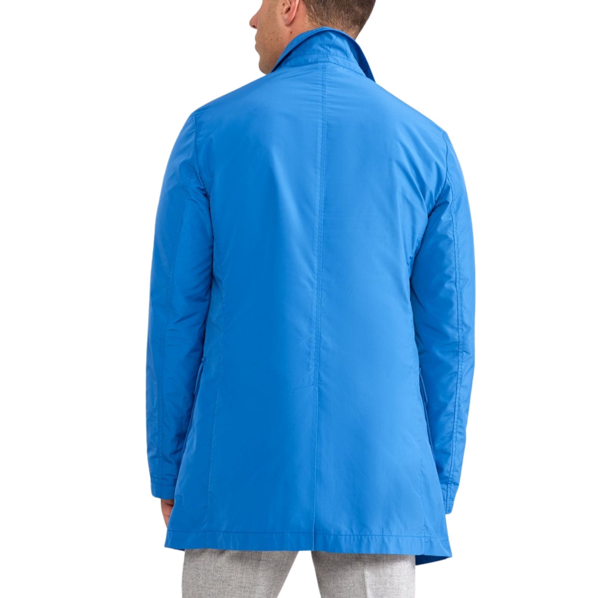Distinguished nylon raincoat in cobalt with pinstripe cuff detailing and a notch lapel.