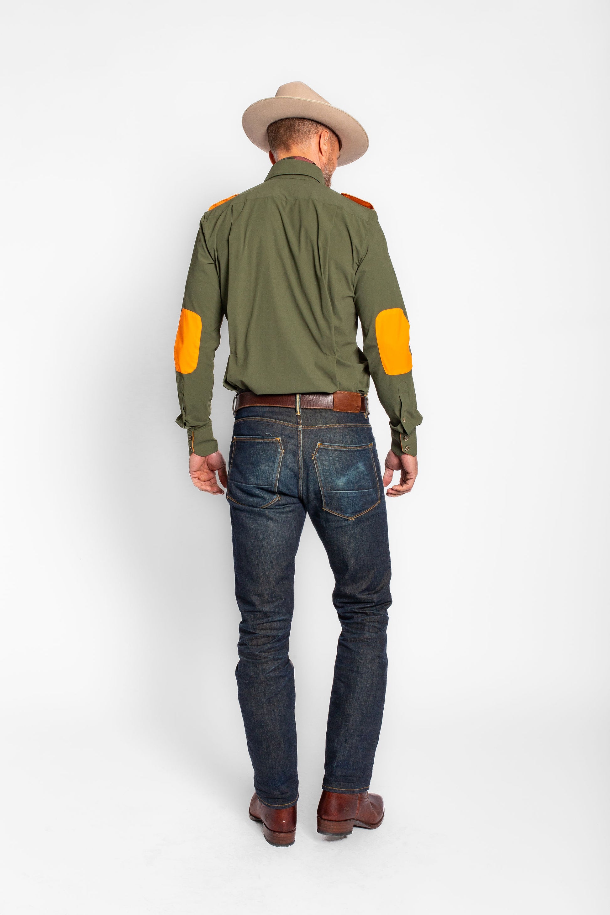 Practical and polished, this field shirt features blaze orange patches, two button cuffs and pleated back detailing. Made from a moisture wicking, breathable, stretch performance fabric. Handcrafted for in the field and ultimate flexibility, this shirt is essential for any sportsman. Luxuriously designed to achieve the highest quality and to weather the most challenging outdoor elements, experience Hadleigh’s not-so-standard sports shirt.