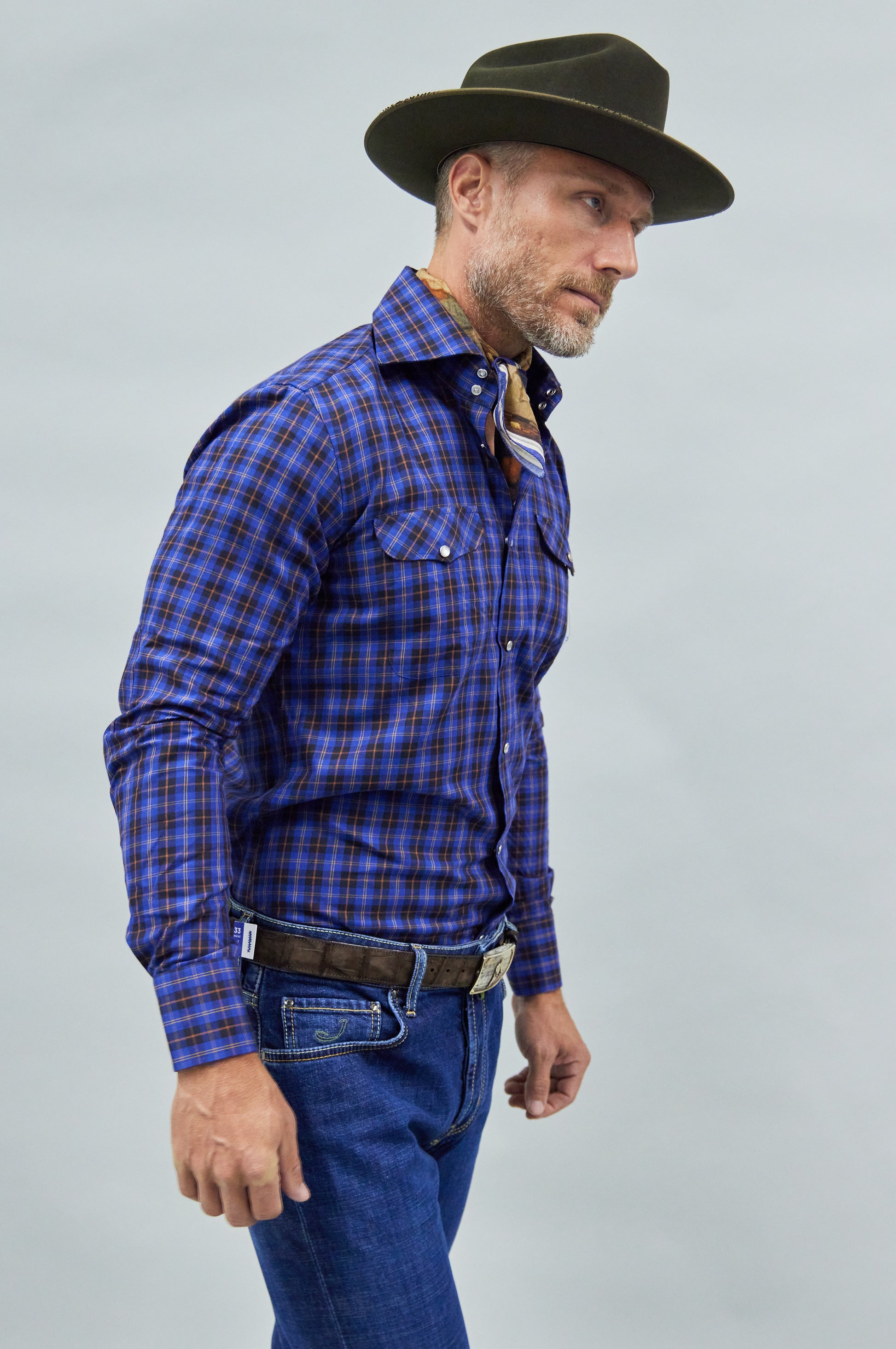 Practical and polished, this Blue Plaid field shirt features pearl snap cuffs and placket. Handcrafted for in the field and ultimate flexibility, this shirt is essential for any sportsman. Luxuriously designed to achieve the highest quality and to weather the most challenging outdoor elements, experience Hadleigh’s not-so-standard sports shirt. Part of our exclusive holiday collection.