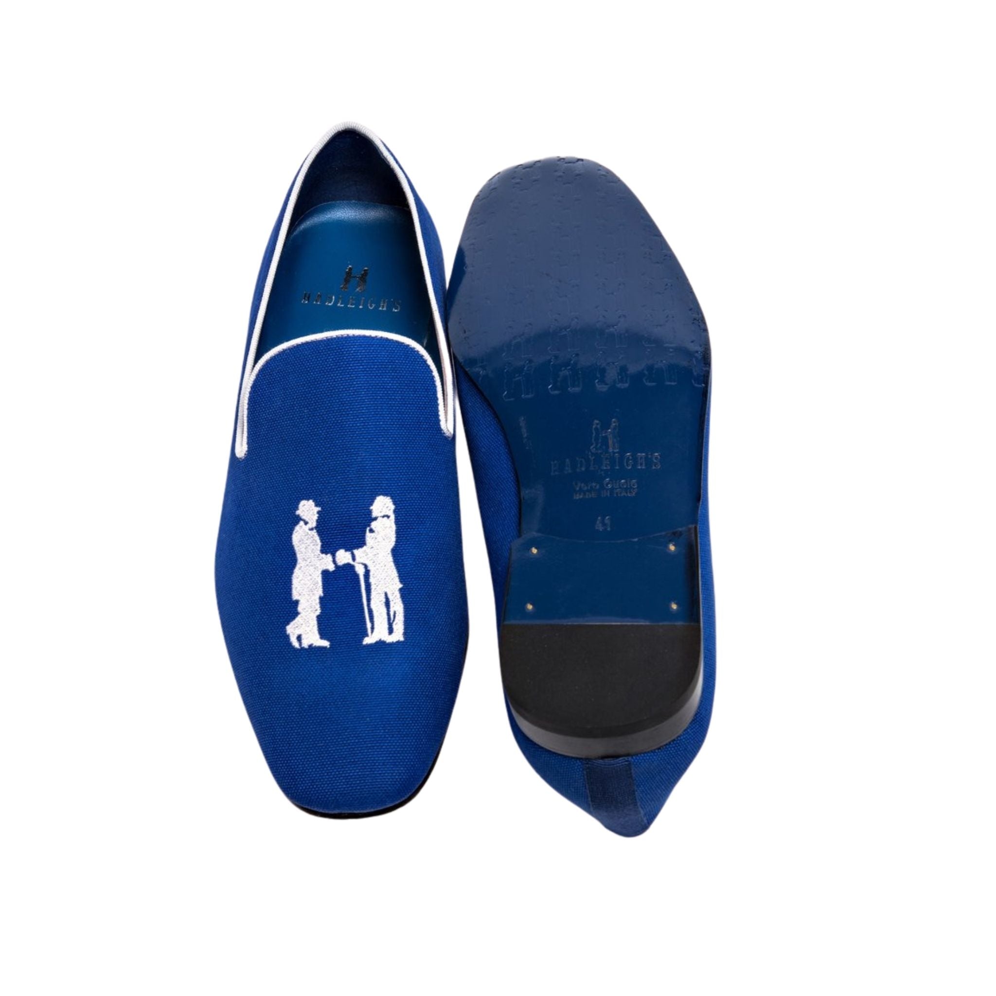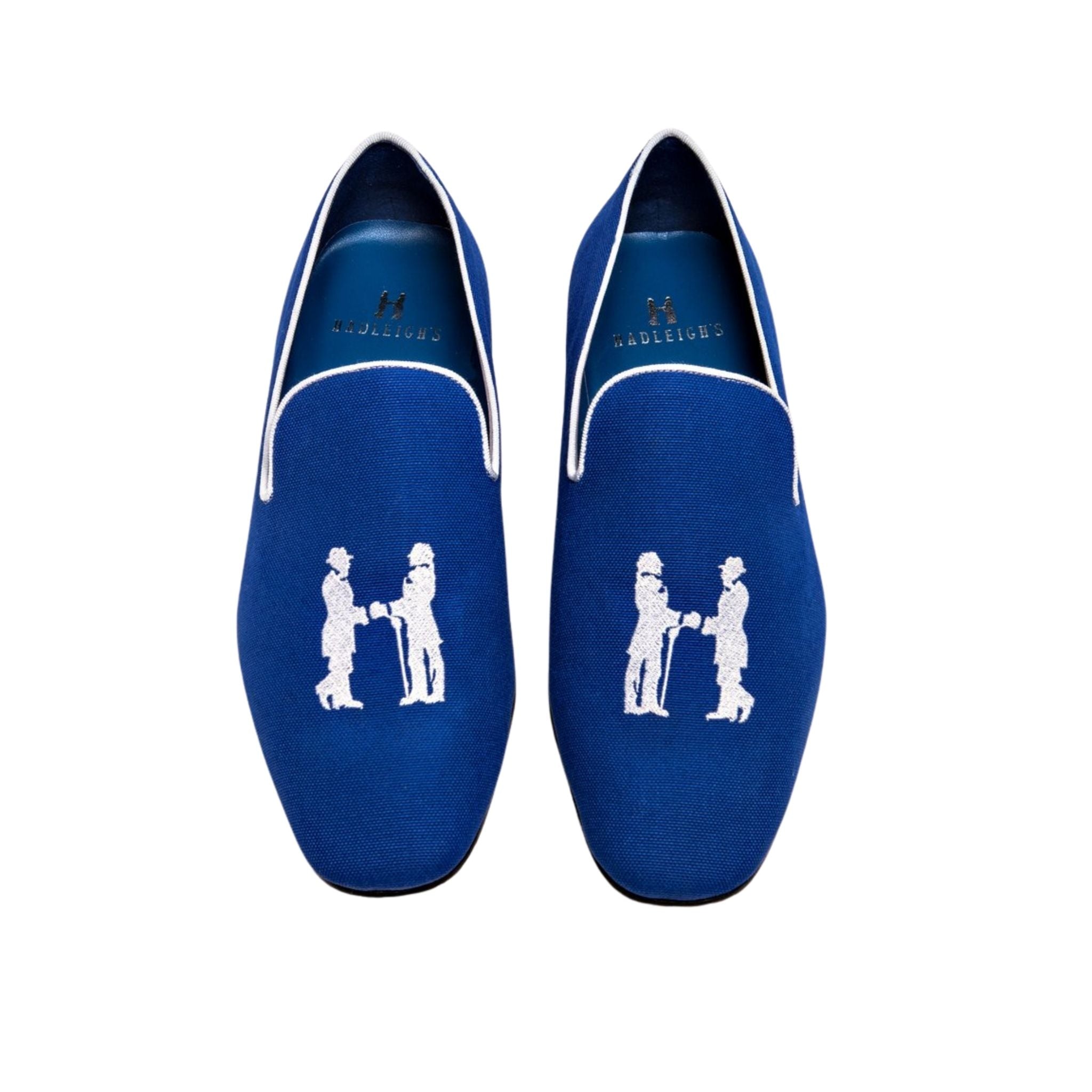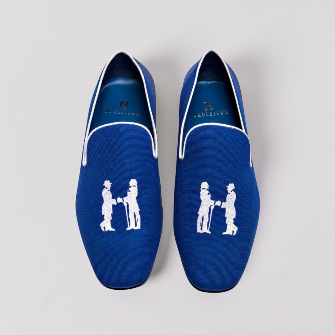 Handmade in Italy using the finest fabrics and embroidered craftsmanship, Hadleigh’s signature men’s smoking slippers are the timeless answer to leisurely, yet luxurious, footwear for any style. Each iconic pair sports a bold blue sole and heel striping, in addition to Hadleigh’s iconic logo with two refined gentlemen shaking hands, and are the perfect polished staple no matter what the occasion. Discover a new standard of carefully crafted footwear for the renaissance man.