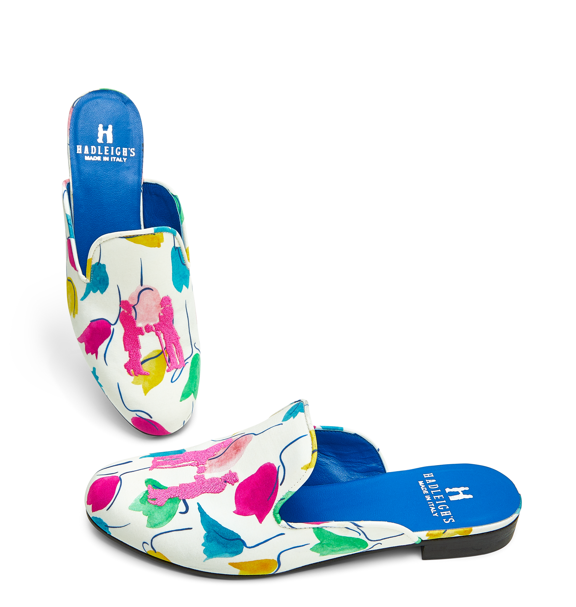 Handmade in Italy using the finest fabrics and embroidered craftsmanship, Hadleigh’s signature slippers & mules are the timeless answer to leisurely, yet luxurious, footwear for any style. Each pair features a bold blue sole, in addition to Hadleigh’s iconic logo with two refined gentlemen shaking hands, and are the perfect polished flat no matter what the occasion. Discover a new, elegant standard of carefully crafted footwear.